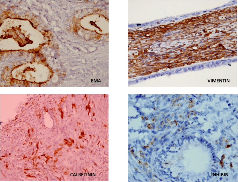 Immunohistochemical staining showed pan cytokeratin and epithelial membrane antigen positivity in the mucinous epithelium. The granulosa cells were positive for Vimentin, Inhibin and Calretinin. (Figure 2) The endometrium revealed simple hyperplasia and right ovary showed a follicular cyst. Cervix and tubes were unremarkable. The pelvic lymph node showed reactive hyperplasia.