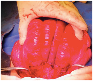 Subsequently, the tubal arteries were ligation with polyglycolic acid, as it was not considered successful, the Hayman compression suture was performed. The uterus is exteriorized and rectified, before executing the compression suture, the uterus is manually compressed and it is verified that this maneuver reduces bleeding. Next, the compression suture is performed. A transfictive point is made, with a straight needle, directly anterior to posterior to the uterus, at the level of the uterine segment and 3-4 cm medial to the lateral border of the uterus. The suture is then directed to the fundus and tied there, while the assistant makes forceful uterine compression (Figure 3).