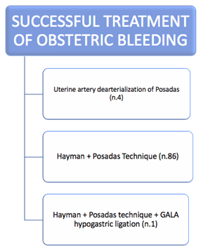 Complications associated with postpartum obstetric hemorrhage do not occur due to blood loss, but rather to ineffective maneuvers to stop bleeding, which could be avoided if they were carried out properly, its prevention and timely treatment. These, despite being carried out by competent professionals, with demonstrated skills and adhering to the best clinical practices, on many occasions fail to stop the bleeding, making surgical intervention necessary.1,2 In this study, we will only report the advanced surgical techniques, defined as compressive sutures, double and triple desarterialization of uterine arteries and hypogastric ligation. The techniques of minimum invention such as urterine clamping with zea technique, compressive balloons, uterine massage and uterine bimanual compression, are not reported in the series of cases, as it is part of the unique and prophylactic maneuver in the attention. Raising the suspect index of obstetric hemorrhage, as well as timely and rapid intervention by trained hands, is without doubt the basis of the cornerstone as described in this drafting. As in emergency medical courses, trauma, sepsis etc. before the catostrophe improve the forecast, surgical time. And postoperative state, as well as quality of life in our patients. Reducing morbidity not only maternal mortality is a current priority, healthy moms, healthy families, it is equivalent to a better society.2,3