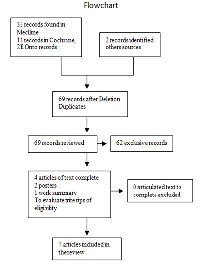 Search databases yielded 72 records; after removing duplicates, 69 were selected to review the title and summary. Of these, 62 were excluded and reviewed in full text 4. In the search for references and products presented at scientific events additional 3 studies were included.7 work finally met the eligibility criteria for the review (Figure 1).
