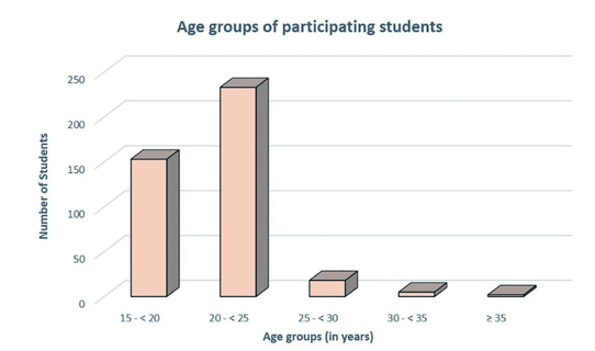 The total number of undergraduate medical students recruited for statistical analysis in the current study was 411 male and female students (out of a total 1551 students, with a percentage of 26.50%). The sociodemographic characteristics of the participating students are shown in (Table 1). The main age group of the involved students (Figure 1) was between 20 and 25- years -old (233, 56.69%). Female students prevailed over male students (393 females and 18 males), with a dominant Saudi nationality of Arabic ethnicity (260, 63.26%, and 344, 83.70%, respectively).