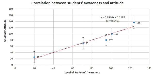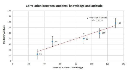 To know which of our study’s hypotheses is correct (H0 or H1), we used the scatter plot, where the x-axis represents the constant variables (awareness and knowledge scores) and the y-axis represents the dependable variable (attitude towards HPV vaccine). After calculation of the correlation coefficient (r) for both elements, we found that there is a strong positive linear correlation between students’ awareness score and their attitude towards the HPV vaccine (r = 0.9403) which means that with a higher score of students’ awareness, there is a confident active attitude concerning HPV vaccine utilization and recommendation to others (Figure 4). Similarly, there is a strong positive linear correlation between students’ knowledge score and their attitude to HPV vaccine (r = 0.9024), which means that with a higher level of students’ knowledge, there is an assured energetic attitude concerning HPV vaccine utilization and recommendation to others (Figure 5). Accordingly, we can agree with the real hypothesis (H1).