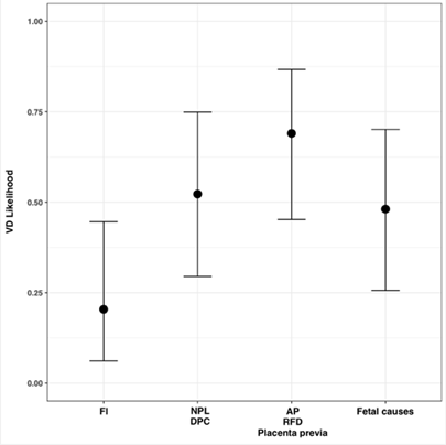 Regarding the likelihood to finish the pregnancy with VD, associated to the PCD indication for FI, it is reduced in a non-statistically significant way when compared with the remaining PCD indications. However, it only results statistically significant when it is compared with the indication for AP, RFD, or placenta previa. The CL and maternal age are inversely proportional to the likelihood of VD. Therefore, the greater CL and the advanced maternal age are associated with a lower likelihood of finishing the pregnancy with VD, although this is not statistically significant.