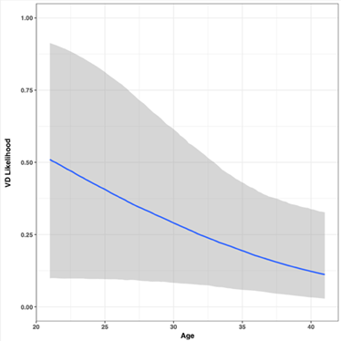 A logistic regression model was fitted to relate the VD with the variables. The PCD indications for NPL or CPD; AP, RFD or placenta previa; or other fetal causes were associated with a higher likelihood of VD than the PCD indication for FI. Nonetheless, the only indications with statistical significance in this relationship were AP, RFD, or placenta previa (OR=7.85 IC95% [1.87, 39], p=0.007) (Figure 3). Furthermore, even without a statistically significant difference, the analysis revealed that the VD likelihood decreases as the age (Figure 4) and CL (Figure 5) increase (OR 0.911, IC95% [0.79, 1.031], p=0.159, OR 0.957, IC95% [0.9, 1.014], p=0.145, respectively).