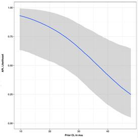 Figure 4 Relation between active phase of labor likelihood and prior cervical length measured in millimeters.