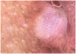 Case N1: A 24-year-old woman with 2 years’ history of a small painless vulval nodule which increased in size, what motivated the patient to consult in our department. The dermatological examination revealed a 7mm pink papule, firm in consistency, located on the right lip of the labium majora (Figure 1). Dermoscopy of the lesion revealed pink and white structures with dotted vessels (Figure 2).