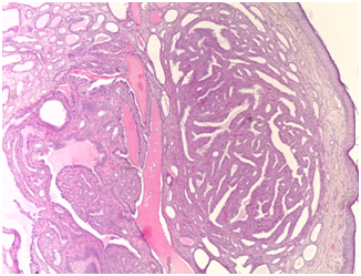Here we present two rare case of a histologically confirmed uncommun tumors of anogenital area and we detail their characteristics which are lacking in the literature. Hidradenoma papilliferum also known as papillary hidradenoma is a benign, slow- growing, asymptomatic, adnexal tumor that primarily affects the anogenital area of adult women.1 It was first described in 1878 by Werth. Since that time, different authors have suggested various theories relating to pathogenesis and origins of this tumor.2 Although the origin of HP was previously thought to be an apocrine sweat gland, recent studies have suggested that it may derive from the anogenital mammary-like gland.3 Clinically, the majority of hidradenoma papilliferums are usually present as a solitary, asymptomatic, well-circumscribed, slowly growing, nodular, nonulcerated, cystic or pedunculated lesion measuring in most cases between 0.5 and 3cm in diameter.1 The overlying skin may be smooth, thickened, atrophic or ulcerated, and may have a skin-coloured, red, brown or blue appearance. Some tumors may spontaneously drain serous or haemorrhagic material.4 This neoplasm may be found on the labia minora (50%) labia majora (40%), fourchette (7%) and clitoris (3%).5 Rarely, it can be seen over the head and neck, and over modified apocrine gland areas such as breast, external ear canal, and eyelid. It is then referred to as ectopic hidradenoma papilliferum.6 Due to its variable and non-specific clinical presentation it might be difficult to make a correct diagnosis of this tumor.4 In our cases, the tumors were asymptomatic and diagnosis was finding of a physical examination, suggesting an underestimation of the prevalence of these tumors. Its differential diagnosis includes various adnexal tumors, epidermal cysts, cutaneous metastases, basal cell carcinoma and melanoma.4 This makes biopsy of all vulvar lesions necessary in order to establish a diagnosis and rule out malignancy.5 The most common dermoscopic pattern of hidradenoma papilliferum is homogeneous area which occupies the whole lesion with vascular and white structures is the most common dermoscopic pattern. The color of this total homogeneous area is pinkish in non-pigmented hidradenoma, bluish, or less commonly brownish in pigmented hidradenoma. The vascular structures objective is arborizing telangiectasias, polymorphous atypical vessels.4 For both patients, the same dermoscopic aspects were revealed. Histopathological examination revealed a partly solid or solid-cystic dermal lesion with anastomosing papillary structures and tubules as well as some glandular areas. The epithelial lining consists of an inner layer of columnar cells with decapitation secretion in the lumen and frequently an outer myoepithelial layer.3,6 Treatment of hidradenoma papilliferum consists of complete surgical excision of the tumor with free margins. Recurrence has been reported but is uncommon.5 In our case, the direct approach was sufficient for complete excision because the lesion was located in the labium majora. The tumor has got a good prognosis and malignant transformation is extremely rare.6