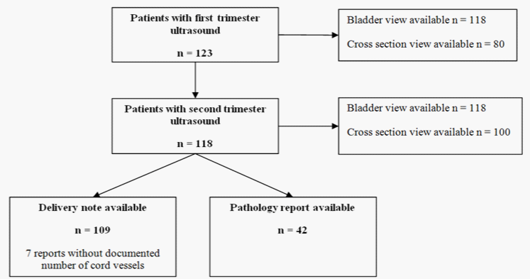 The number of umbilical cord vessels determined during first and second trimester ultrasound scans also was compared to the description of the number of vessels noted at the time of birth in the delivery report and/or placental pathology report if available.