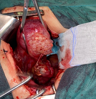 Figure 1 Intraoperative image showing the presence of molar vesicles exceeding the serosa of the globular uterus, with a heterogeneous-looking ovary.
