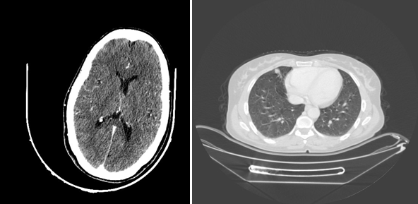 Figure 3 Scanographic image: on the left at the cerebral level: a cross section of the C+ skull not showing an image related to a secondary location, unlike the thoracic level: showing a right lower lobe nodule.