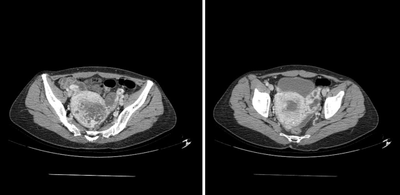 And so, the pelvic MRI was in favor of a gestational trophoblastic tumor invading the serosa coming into contact with the ovary and the rectum posteriorly measuring 65*45mm associated with thrombosis of the left internal iliac vein and the homolate ovarian vein, just as a Hemoperitoneum of low abundance (Figure 4).