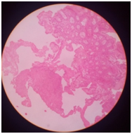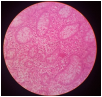 A twenty three year male presented with loose motion on and off, intermittent bleeding per rectum (P/R) since last 3years, bilateral pedal edema and scrotal swelling followed by generalized anasacra for 1year. The loose motion was 10 to 12times per day, small in amount, associated with tenesmus and intermittent bleeding P/R, there was nocturnal symptoms and significant weight loss. Patient was having history of constipation earlier started before this episode associated with prolongs straining during defecation. Stool was occasionally mixed with fresh blood and there is no history of manual evacuation or enema use. During this episode he had significant weight loss despite normal appetite, developed generalized anasarca and scrotal swelling. No history of fever, joint pain, pain in eyes, skin ulcerations, hypertension, diabetes and tuberculosis in past. There was no history of substance abuse/allergy. General examination revealed pallor, generalized anasacra, ulcereated oral mucosa, lusterless skin and brittle hair. Gastrointestinal system revealed ascites, no mass abdomen. On per rectal examination there were lax anal sphincter and polypoidal mass lesions felt to the examining finger. On colonoscopy there is circumferential nodularity, erosions and narrowing from 5 to 12cm, biopsy came as tubular adenomatous changes with inflammation. Low anterior resection with transverse colon loop colostomy was done. Resected specimens do not show any evidence of malignancy. Colostomy closure was done after 4 month. Post operative period was uneventful. Patient again had symptoms after 6months, and develops generalized anasacra. He was managed with multiple albumin infusions. Colonoscopy examination done revealed lax anal sphincter, multiple yellowish white polypoidal lesions involving anorectal junction and lower rectum. Rest of the colonic mucosa up to terminal ileum appeared normal (Figure1). Gastroduodenoscopy was normal with negative rapid urease test for H Pylori. On biopsy there is mucosal ulcerations with granulation tissue, crypt dilatation and hyperplasia,dense lymphocytic and plasma cell infiltrations in lamina propia (Figures 2&3). It was consistent with rectal cap polyposis. Patient was managed conservatively and planned for endoscopic polypectomy. There were symptomatic improvement after the procedure and was on regular follow-up.