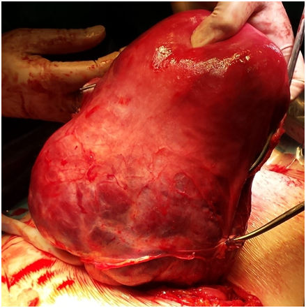 Placenta accreta is a placenta implantation that results in an abnormal firm adherence to the uterine wall.1 The incidence of placenta accrete is rising due to the growing numbers of cesarean delivery. There is a significant contribution to the maternal morbidity and mortality that leads to postpartum hemorrhage and emergency peripartum hysterectomy.2,3 A 31-year-old woman presented for elective cesarean section due to the suspicion of abnormal placental growth, ultrasound examination and magnetic resonance imaging show placental tissue in uterine scar. Delivery time was at 36+2 weeks of gestation, patient was cared for in the intensive care due to severe blood loss during surgery. The postoperative course was uneventful, and the patient was discharged on day 7 in good conditions.