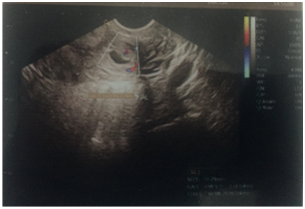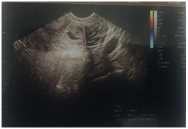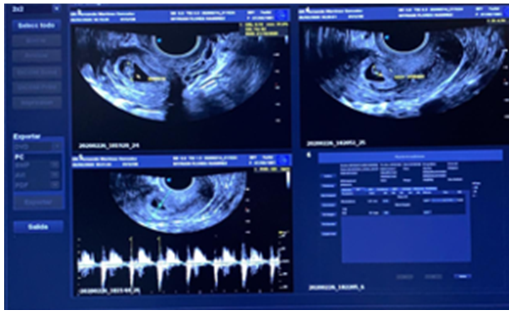 The endovaginal ultrasound reported a uterine cavity with a 14mm endometrial mid echo, bilaminar and homogeneous. Cervix with ovoid image of echogenic guresus wall, anechoic interior, gestational sac with image inside with a 4mm embryo, in relation to 6sdg pregnancy (Figure 1) (Figure 2). With beta fraction of 9145mUI/mL. Ectopic pregnancy is diagnosed.