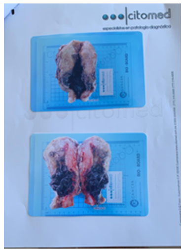 Surgical treatment was decided, conservative management was decided, surgical management consisting of manual uterine aspiration was started, clamping of the uterine arteries with the zea technique, placement of an intracervical foley catheter with 30cc of solution, to prevent surgical bed bleeding, however identifies obstetric hemorrhage, which does not refer to conservative management, for which reason obstetric hysterectomy is performed (Figure 4).