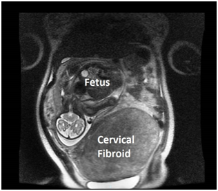 Figure 1 MRI image of the fetus and the large cervical fibroid at 33 weeks gestation.