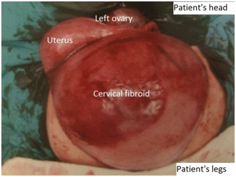 Intra-operatively, an open myomectomy was intended for a 20 x15cm cervical fibroid. However, there was profuse bleeding from the broad ligament and the left uterine artery, which was supplying the cervical fibroid(Figure 5). As such, the team proceeded with a total hysterectomy and bilateral salpingectomy to cease the haemorrhage. The estimated blood loss was 1500ml and she received 2 units of blood transfusion. She had an uncomplicated recovery otherwise. Histology revealed a degenerative benign leiomyoma weighing 2375g and measuring 21 x 19 x 13cm.