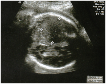Figure 1 Antenatal ultrasound in transverse plane showing a 4 cm homogenous hypoechoic area in right posterior brain.