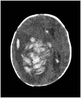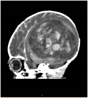Figure 4 CT of baby brain showing a heterogenous enhancing mass that is occupying right cerebral hemisphere, measuring 8.0 x 5.3 x 7.1 cm, causing significant midline shift towards the left. There were areas of hyperdensity showing intraventricular extension of haemorrhage to the right frontal horn, posterior horn and third ventricle.