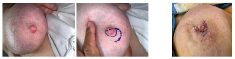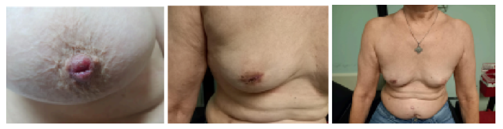 The following clinical photographs correspond to different patients diagnosed with mammary Paget’s disease, treated with a conservative surgical approach aimed at preserving the areola and reconstructing the nipple. All images were obtained and used with the patient’s informed consent for academic and scientific purposes (Figure 1) (Figure 2).