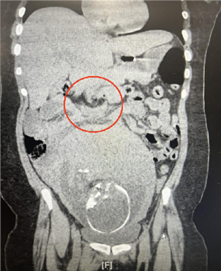 The patient was initially administered intravenous fluids and morphine. Laboratory studies and an ultrasound of the abdomen and kidneys were obtained to evaluate the patient’s flank pain; both were unremarkable. After several hours of monitoring, the patient endorsed no improvement in pain and non-contrast CT of the abdomen and pelvis was performed. Imaging was negative for nephrolithiasis and other renal pathology. Appendix appeared normal without signs of inflammation or enlargement. However, study was significant for a dilated loop of small bowel in the right mid abdomen, laterally, with significant adjacent mesenteric edema. There is swirling of mesenteric pedicle with no visualization of the superior mesenteric vein distal to the area of swirling and focal tapering of the superior mesenteric artery. Findings are suspicious for small bowel volvulus or internal hernia with concern for small bowel mesenteric/bowel ischemia, Figure 1. General Surgery consultation and evaluation advised immediate surgical management. The patient underwent diagnostic laparoscopy; an internal hernia was identified and reduced, and Petersen’s space was surgically closed. The patient’s postoperative course was unremarkable, and she underwent an uncomplicated scheduled repeat cesarean section at term.