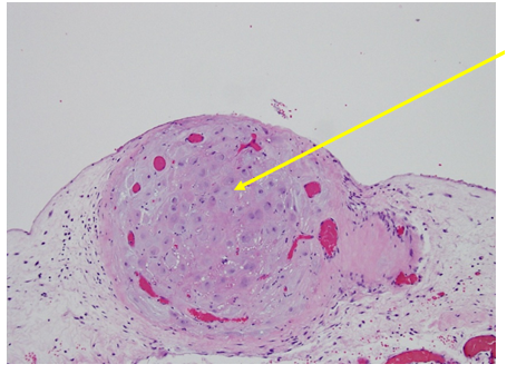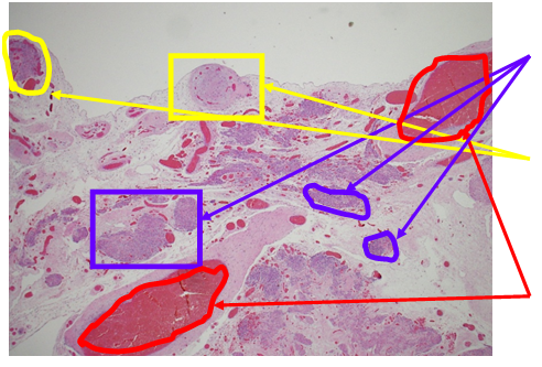 1B: Stromal cells resembling decidua (Light Purple),br>Vessels (red circles)
