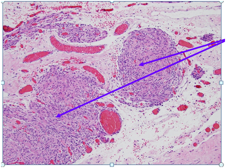 Figure 2 Higher Magnification of Box 1A from Figure 1: Smooth muscle arranged like leiomyomas / Nodules of smooth muscle bundles proliferation which are bland looking and lack mitoses = Leiomyomatosis (Purple Circles) Hematoxylin and Eosin Stain (H&E stain or HE stain). 1A: Sections show a low grade spindle cell proliferation, fascicular in appearance, forming small and large nodules. The spindle cells show no cytological atypia, and no mitoses are identified. The nodules are situated in a fibrous and vascular background with interspersed collections of decidualized cells. The spindle cells are positive for SMA, and are negative for Melan-A and HMB-45. The findings, combined with the clinical presentation, are compatible with disseminated peritoneal leiomyomatosis. A leiomyoma arising from the serosal aspect of the uterus is also a consideration, though considered less likely.