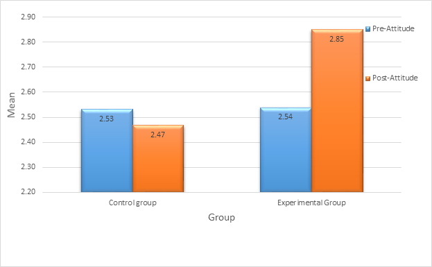 The result from Figure 1 shows the summary of descriptive statistics of the effect of sensitization on the attitude of female health workers towards cervical cancer screening. It shows that in the control group, the pre-attitude mean rating of the female health workers towards cervical cancer screening was 2.53, SD=0.35 whereas their post-attitude mean rating was 2.47, SD=0.32 and their mean attitudinal change was -0.07, SD=0.47. The result further showed that in the experimental group, the pre-attitude mean rating of female health workers towards cervical cancer screening was 2.54, SD=0.39 whereas their post-attitude mean rating was 2.85, SD=0.35 and their mean attitudinal change was 0.31, SD=0.53.