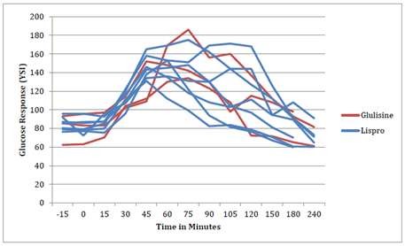 Methods: Within a single-center randomized controlled trial, we evaluated 16 women with GDM in two parallel arms. All women were on basal treatment with insulin NPH; 6 women randomized to the study arm (insulin glulisine) and 10 were in the control arm utilizing the current standard of care for meal-related bolus insulin (insulin lispro). In addition to weekly study visits, women participated in a four-hour in-clinic meal challenge which involved a standardize meal and blood glucose (YSI) measurements. Statistical analysis was based on women who participated in the meal challenge and had more than 2 weekly visits (3 study arm women and 8 control arm women). Participants were all Latina and were between 24 and 38 years old.