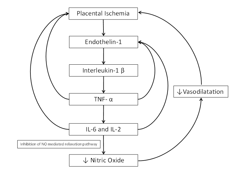 Pre-eclampsia is associated with a increased levels of circulating inflammatory cytokines and ET-1. There may be interrelated and interlocking positive feedback loops by which cytokines promote release of endothelin or vice-versa from endothelial cells leading to systemic endothelial dysfunction (Figure 1). The decrease in vasodilatation is influenced by the presence of endothelin and inflammatory cytokines which inhibits NO mediated relaxation pathway in systemic vessels in pre-eclampsia. ET-1 along with inflammatory cytokines level may serve as a prognostic parameter, indicating the possibility of development of pre-eclampsia.