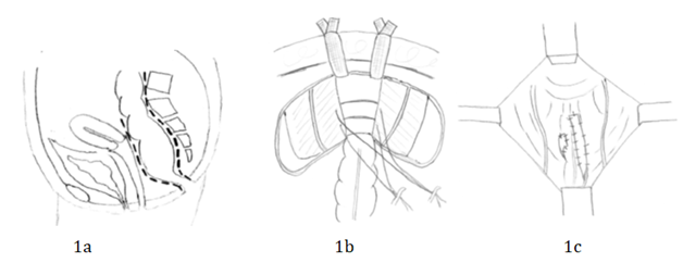 Details of the procedure have been previously published.9,10,16 however, since its original description, several technical modifications have been introduced and these will be described. The procedure is performed with the patient in Lloyd Davies position using a midline incision. Both ureter were identified at the pelvic brim and tracked distally to the pelvic floor. Patients with an intact uterus underwent a hysterectomy. The rectum was fully mobilized into the inter-sphincter plane anteriorly with dissection of the anovaginal septum to the level of dentate line (Figure 1a). The extended rectal dissection is more than what is required for Rectopexy but we found this useful as it allowed the rectum to be displaced further posteriorly to facilitate subsequent levatorplasty. Using a vaginal approach, a longitudinal incision was then made in the posterior wall of the vagina and large vaginal packing gauze was then placed through this incision and tied firmly to the pubic symphysis to retract the bladder and vagina anteriorly leaving the elevator hiatus clearly displayed (Figure 1b). Through this vaginal opening, heavy vicryl sutures were inserted into either side elevator any by the perineal surgeon using a Zacharin’s needle (a 20 cm tapered needle with an eyelet) taking generous bites of the elevator. The abdominal surgeon played a crucial role in retracting the ureter so as not to incorporate them in the levatorplasty and in guiding the safe passage of the Zacharin needle to avoid inadvertent injury to bowel loops. These vicryl sutures were then held in forceps until 3 to 4 levatorplasty sutures were placed. The defect in the vagina is then closed using a separate continuous 3.0 vicryl suture and levatorplasty completed by tying the vicryl sutures. Mesh sacrocolpopexy and Rectopexy using Marceline mesh was then carried out. The mesh was shaped into a “Y” with one limb secured to sacral promontory. The other two limbs of the mesh were used for an offset wrap around the rectum (Figure 1c). Vaginal vault is secured to the longitudinal limb which lies between the rectum and vagina. All patients received bowel preparation and intra-venous antibiotics. A Jackson-Pratt drain and supra-pubic catheter were used routinely. Supra-pubic catheters were removed when post void residual volumes were less than 50 ml for three consecutive voids. Depending on stool frequency and volume, fiber or aperients were started to optimize stool volume and consistency so as to improve bowel control. Patients were routinely followed up at 6 weeks, 3 and 12 months post-operatively.