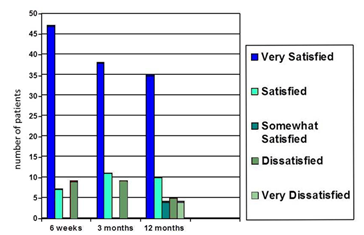 Figure 2 Patient rated satisfaction on a 5 item Likert scale, assessed at each follow up review at 6 weeks, 3 months and 12 months for 58 patients.