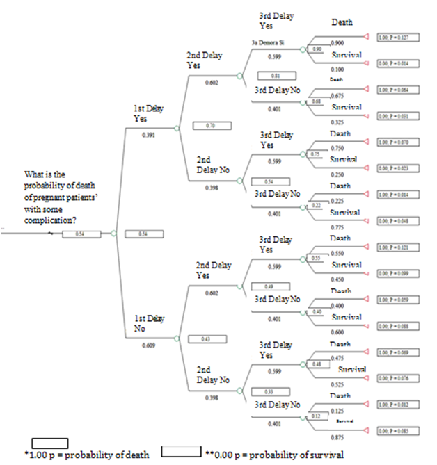 Through the elicitation process, the probabilities of delays were independently identified first. In other words, the probability of having experienced the first, second or third delay was specified initially. Next, the probability of death of each of the possible combinations was determined. To elicit the probability of death due to delays, the question was: What is the probability of death of pregnant women with some kind of complication? At the end of the process, the median and its ranges were determined for the first, second and third delays. Using Excel, tables including the question asked to the experts, the upper range of probability, the lower range of probability, the highest probability (median), and the specific probabilities of each delay were built. The probabilities of death that were elicited were represented on a probability tree.