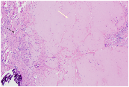 Figure 7 Patient 2, Pathology slides: a. The pathology figure 7a would roughly correspond to the red circle in figure 6: Low power view of resected fibrotic cesarean scar (white arrow) with placental site nodule (black arrow). (H&E stain) b. High Power view of placental site nodule (black arrow) showing hyalinization with degenerative implantation site trophoblast. (H&E stain).