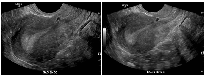 The REI workup included ultrasound, hysterosalpingogram (HSG), MRI and hysteroscopy with lysis of adhesions, and endometrial sampling for evaluation of failed intrauterine insemination, 6 months prior to referral. The initial ultrasound showed mucus accumulation and free fluid in the uterus (Figure 1). Hysteroscopy revealed a small out-pouching in the lower anterior uterine segment. A subsequent MRI in our clinic confirmed both the ultrasound and Hysteroscopic findings, revealing a small CSD, (Figure 2) for which she desired surgical correction.