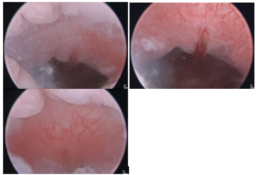 Figure 5 Patient 2, Hysteroscopic images: Hysteroscopy showing anterior CSD cephalad to the internal cervical os, with an unremarkable uterine cavity.