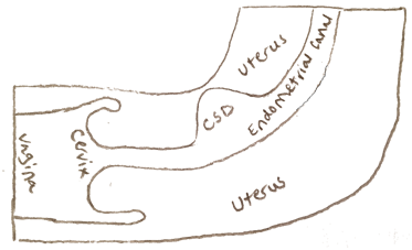 The patient, a 34 year old female, gravida 4, para 3013 with history of three previous cesarean deliveries, who presented to our clinic for evaluation of CSD complaining of dysmenorrhea, menometrorrhagia, polymenorrhea and persistent vaginal mucus discharge. She also complained of prolonged menses with menorrhagia after her third cesarean delivery, resulting in symptomatic anemia - lightheadedness, fatigue and weakness. Her menses lasted 10-11 days, with the first several days being heavy bleeding, requiring the use of a tampon, in addition to hourly pad changes. The patient and her partner planned to conceive but desired surgical repair of her symptomatic CSD prior to conceiving.