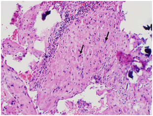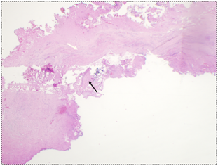 The CSD resection specimen was sent for pathologic examination which showed fragments of endomyometrial tissue with scarring consistent with the cesarean scar, along with old placental side nodule with dystrophic calcifications (Figure 6) (Figure 7).