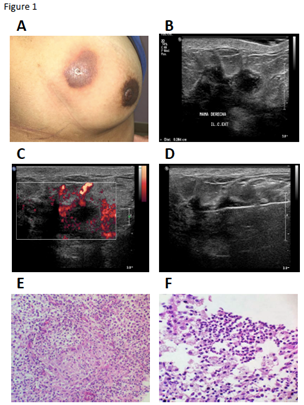 C and D: Second breast sonography posterior to antibiotic treatment, where the lesion persists and is reclassified (BI-RADS 4A). Great irregularity is observed in contours with increased vascularity.