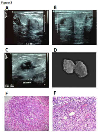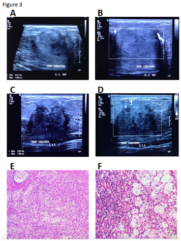 Case 8 (pharmacological-surgery group) (Figure 3): After the second sonography the mass lesion was reclassified from BI-RDAS 3 to 4A (Table 2 and Figure 3A-D). After the surgery, with a confirmed histopathology diagnosis of IGM, prednisone treatment was initiated (35 mg weekly for 2 weeks, 15 mg weekly for 2 weeks and 10 mg weekly for 2 weeks). A mass lesion (1.9x9cm) with irregular borders, with significant hydric content and with vascularity was identified by sonography in the same region of the breast, 12 weeks after the surgery (BI-RADS 3). Thus, prednisone treatment was initiated (10mg per day for a total of 5 weeks). At the end of this period, another breast sonography study reported that the lesion was heterogeneous, predominantly hypoechoic, irregular (0.8 x 1.3 x 0.5) without vascularity (BI-RADS 2), adjacent to another identified lesion (7mm) with similar characteristics (Table 2). Five mg daily of prednisone was indicated for 1 month more. The last sonography reported a residual lesion with fibrotic scar formation. At present, the patient is under observation (Table 2–4).