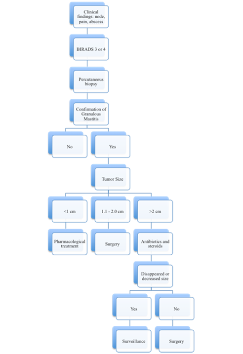 The criteria for selecting each patient’s treatment was based on the size of the lesion, the severity of the symptoms, BIRADS classification, evolution and response to the pharmacological agents according to our own experience (Algorithm 1). Some patients underwent a single treatment with steroid agents (4 cases), surgery (6 cases) or a combination of surgery plus steroid agents (6 cases). The range of resolution of the cases with surgery varied from 7 days to 5 months.