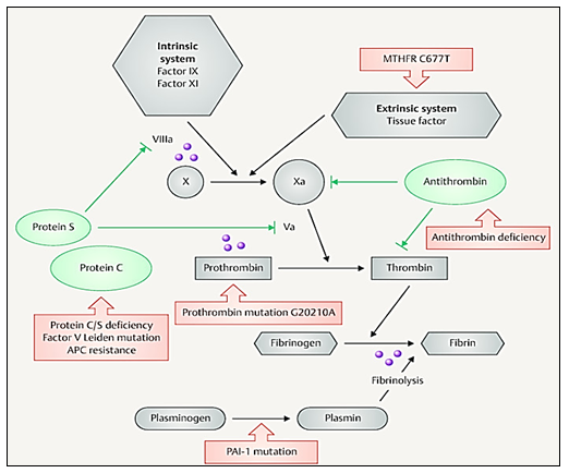 Figure 1 Shows the level in which FVL (Va), Prothrombin, MTHFR and PAI-1 participate. Image obtained from Stefanski A, et al.,9