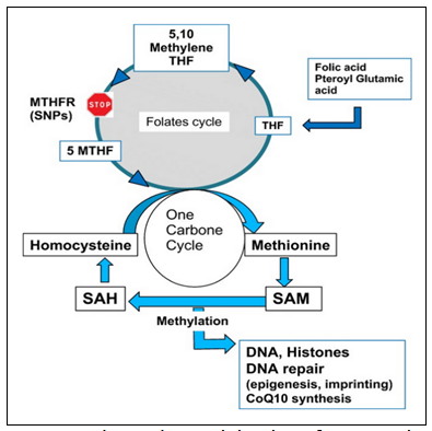 Figure 2 Shows the participation of MTHFR in the folate cycle. MTHF, 5 methyltetrahydrofolate; MTHFR SNP, methylene tetrahydrofolate reductase singlenucleotide polymorphism; SAH, S adenosyl homocysteine; SAM, S adenosyl methionine; THF, tetrahydrofolate. Image taken from Goyco L, et al.,18 SAH (S adenosyl homocysteine) and SAM (S adenosyl methionine).