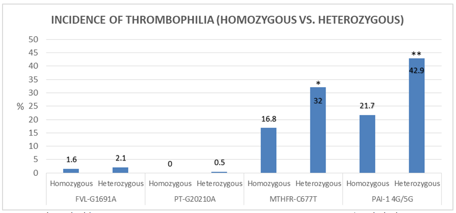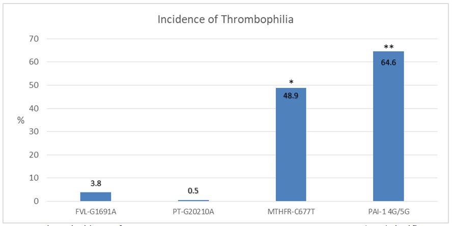 Figure 3 Shows incidence of FVL-G1691A, PT-G20210A, MTHFR-C677T y PAI-1 4G/5G. *Significant difference (p˂0.05) when comparing with MTHFR-C677T vs FVL-G1691A y PT-G20210A. ** Significant difference (p˂0.05) when comparing with PAI-1 G4/5G vs MTHFR-C677T, FVL-G1691A y PT-G20210A.
