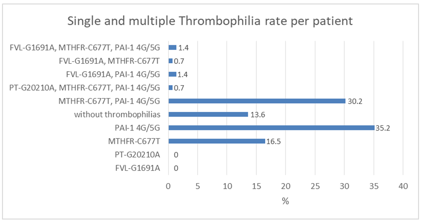 Results: MTHFR-C677T and PAI-1 4G/5G present higher incidence (48.9 and 64%), when comparing with FVL-G1691A and PT-G20210A (3.8 and 0.5%) (p<0.05), higher incidence of PAI-1 4G/5G was observed, when compared to MTHFR-C677T (64.6 vs. 48.9%, p<0.05), difference that was not observed when comparing FVL-G1691A with PT-G20210A (3.8 vs. 0.5%, p>0.05). When patients presented only one thrombophilia, the highest incidence is of MTHFR-C677T and PAI-1 4G>5G (16.5 and 35.2%). Patients with multiple thrombophilias had an incidence of MTHFR-C677T with PAI-1 4G/5G of 30.2%.