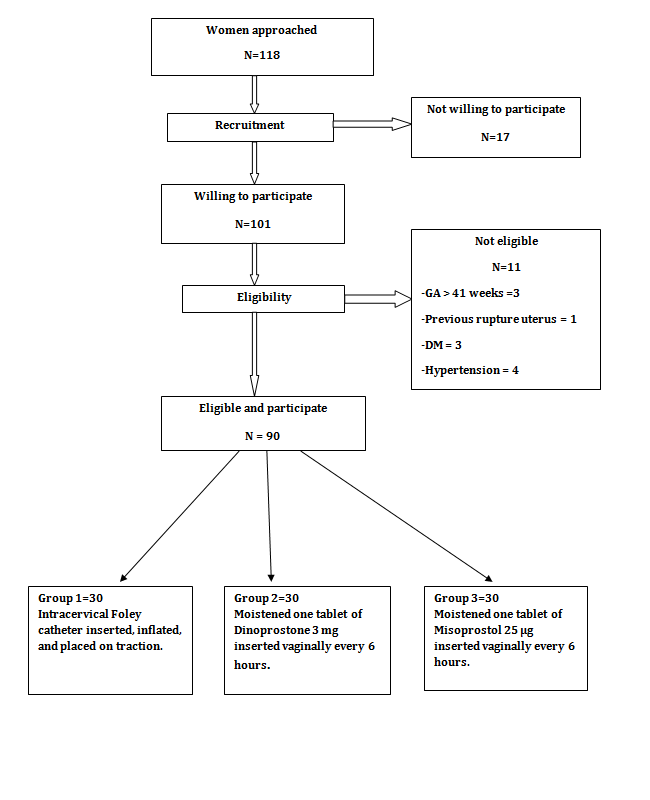The study was conducted on 90 healthy pregnant women with previous one lower segment cesarean section at 37 weeks and beyond, with a Bishop’s score of ≤ 6, intact membranes, reactive non-stress test, normal umbilical arterial Doppler indices, absence of labor and willingness of women to participate in the study. The indications for the induction of labor were pregnancy induced hypertension and controlled diabetes mellitus.
