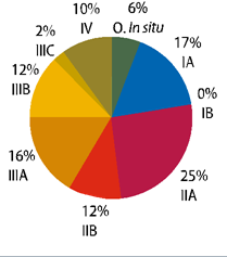 The stadiums of presentation at the time of diagnosis were: Stadium O: 3 patients (5.6%); Stage I: 8 patients (15.7%); Stage II: 19 patients (37.2%); Stage III: 16 patients (31.4%); and Stage IV: 5 patients (9.8%).