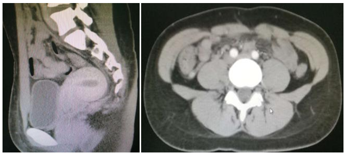 Computed tomography (CT) of the pelvis (Figure 1) showed a cystic mass in the right adnexa suspicious for ovarian borderline epithelial tumor or cystadenocarcinoma. A small amount of free fluid in the cul-de-sac and endometrial thickening were also noted (Figure 1).