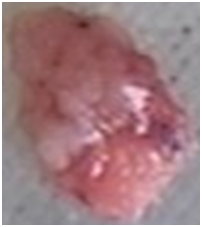 Figure 2 Pathology: Gross appearance of right ovarian tumor with papillary surface: Gray red tissue measuring 1cm X 0.7cm X 0.4cm