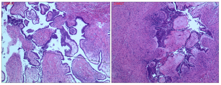 Postoperative pathology of the right ovary revealed serous borderline tumors and corpus luteum cysts. (Figure 2) (Figure 3) The right fallopian tube was negative for malignancy. An endometrial specimen showed early secretory stage but no tumor involvement. The uterine surface nodules were determined to be leiomyoma. Omentum and bilateral lymph nodes were negative for metastasis. Therefore, with SBT limited to the surface of one ovary it was staged as 1C2, which is defined as a tumor that is on the outer surface of at least one of the ovaries or fallopian tubes or the capsule has ruptured before surgery.8